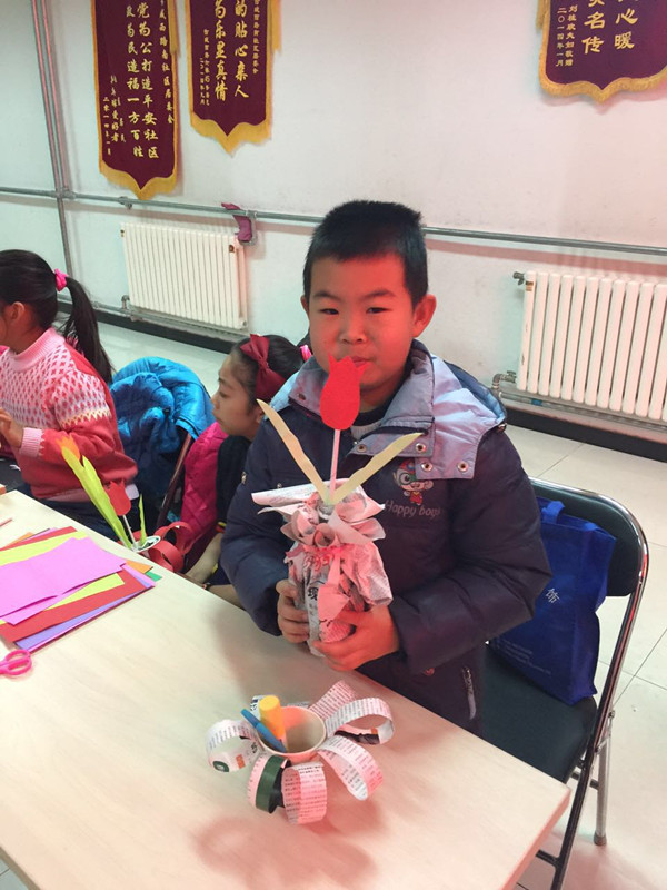 变“废”为美活动进社区 时间:2016-01-28 11:47 来源:$artfrom$ 作者:北京中国书画协会 点击:次 2016年1月27日北京中国书画协会少儿分会来到石景山古城西路南社区进行了一次变“废”为美的公益讲堂活动。协会老师为前来学习的小朋友、大朋友展示了生活中废弃的饮料瓶、纸杯、旧杂志、手提袋等在经过美化后,变成了一件件艺术作品,令大家很惊讶。大家通过跟老师的学习将纸杯装饰成花瓶,并学习用旧杂志制作了郁金香花。活动结束后也燃起了大家学习绘画、手工的热情。 作品展示: (责任编辑:admin)